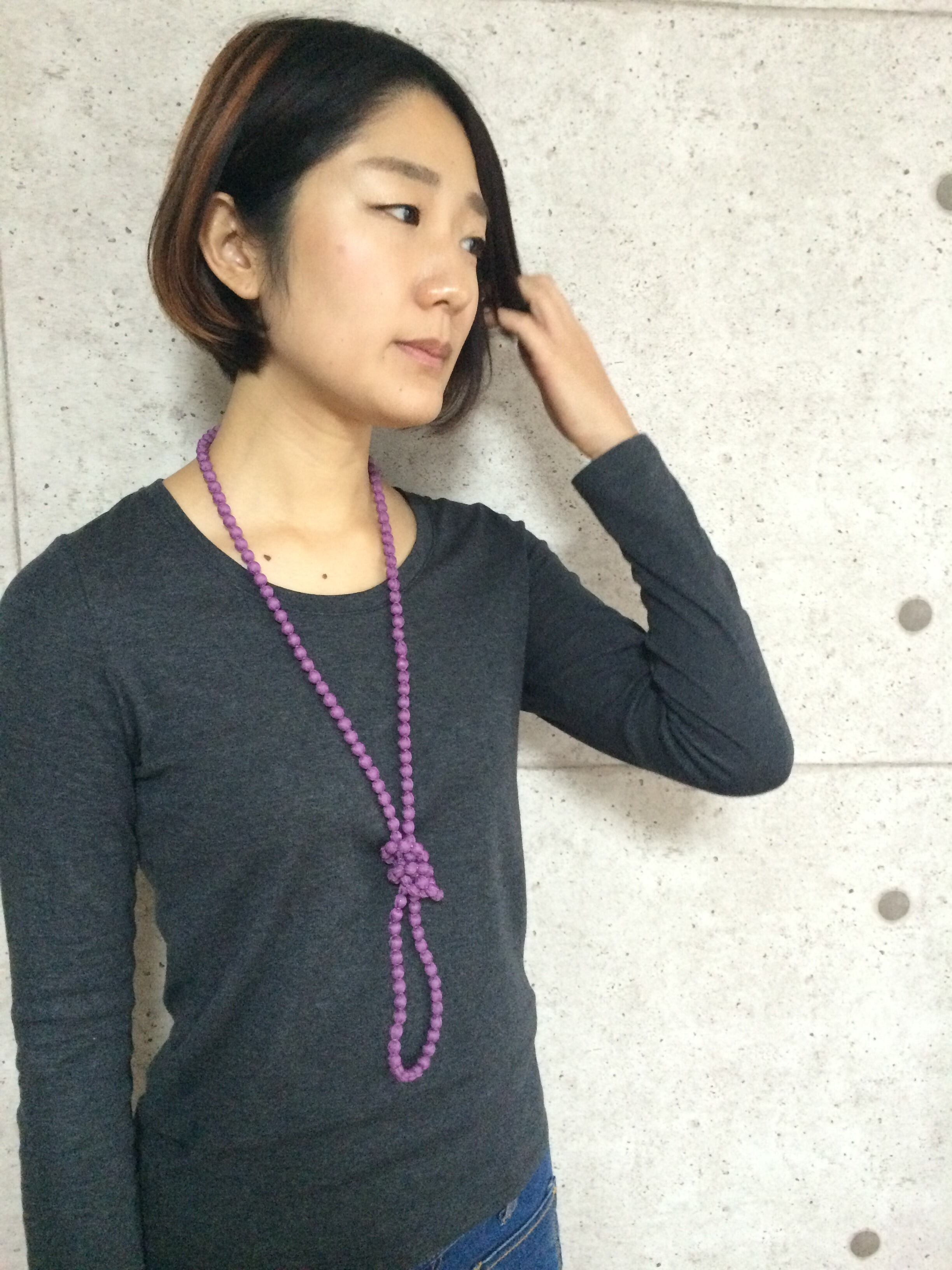 1連としてロング、2重にするとダブル、お腹の前で結んでも使えるアレンジ自由自在のシルクボールネックレス。