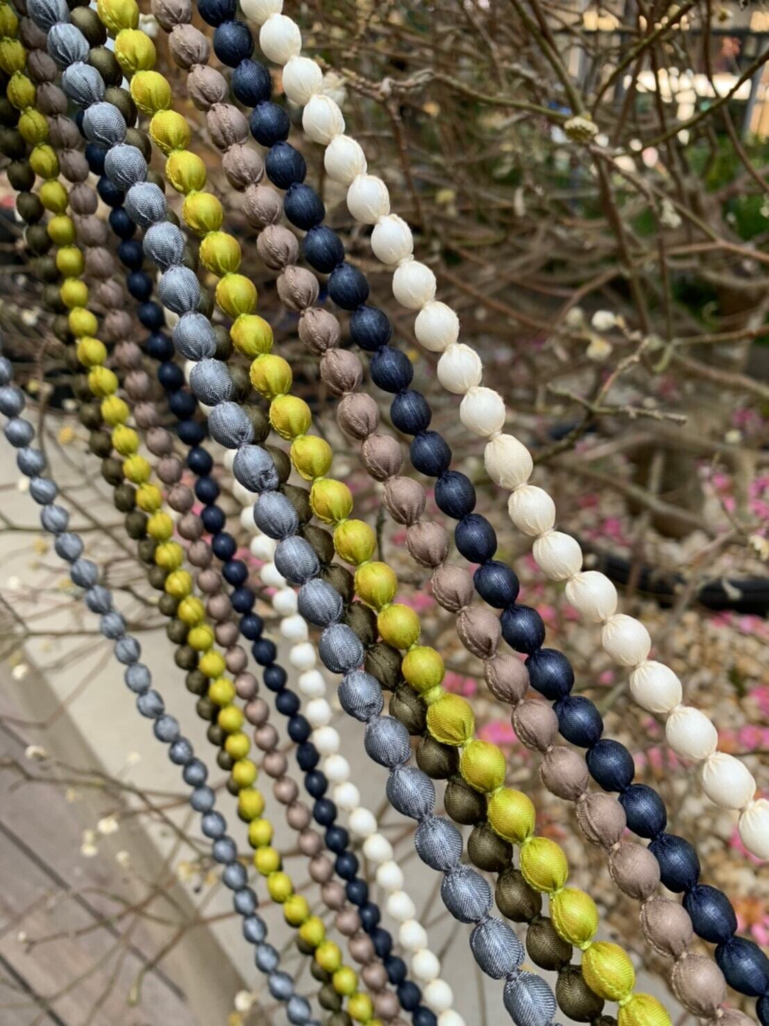 光沢感のあるカンボジアシルクに1粒約7㎜のプラスチックビーズを包み、1つ1つしっかり針を通して作っています。