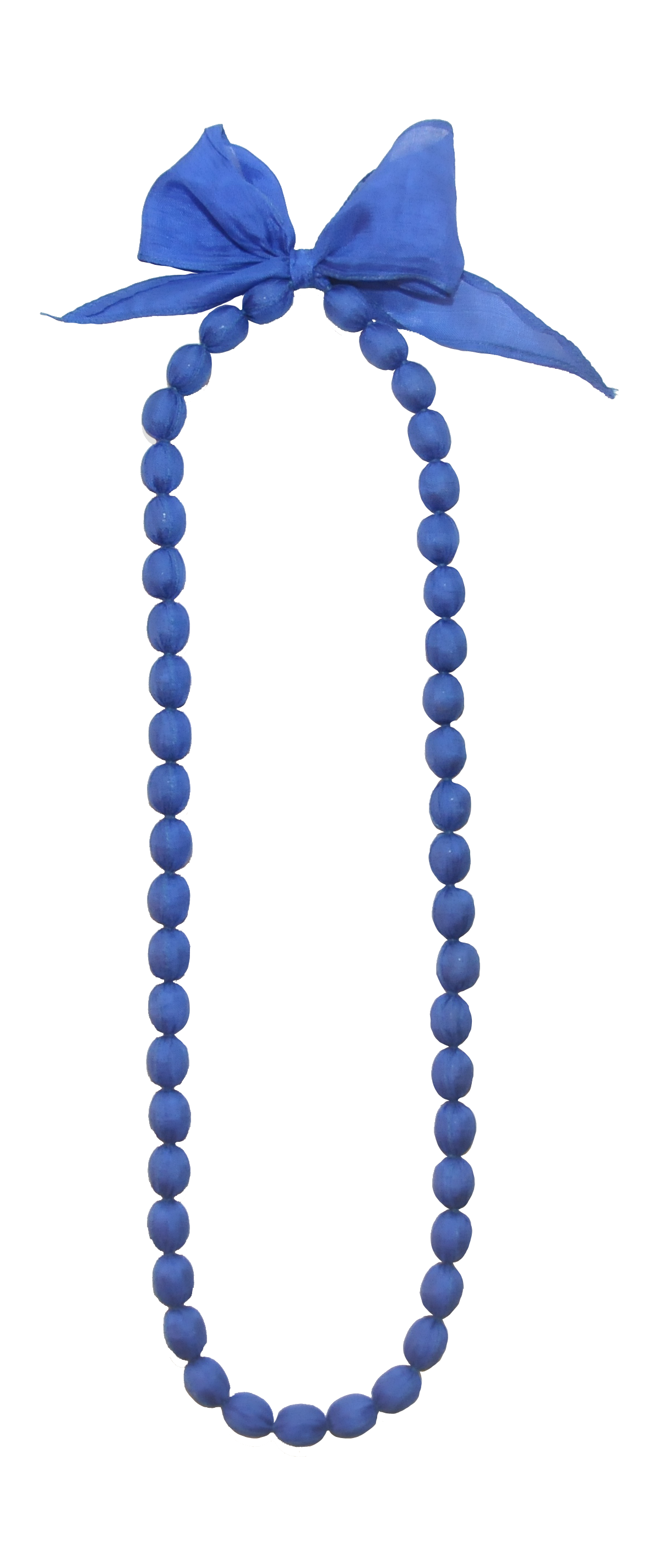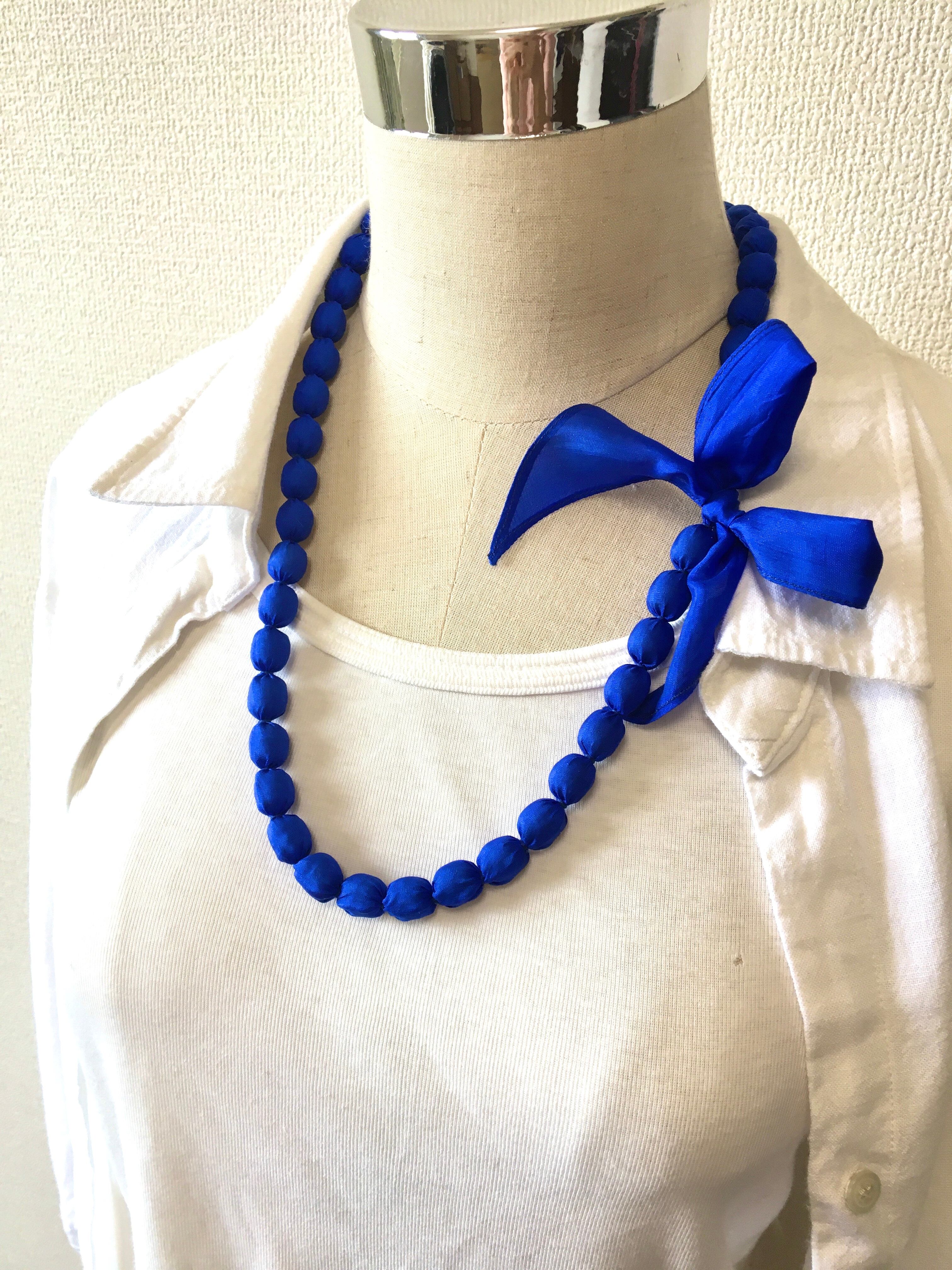 光沢感のあるカンボジアシルクに1粒約1.2㎝のプラスチックビーズを包み、1つ1つしっかり針を通して作っています。
