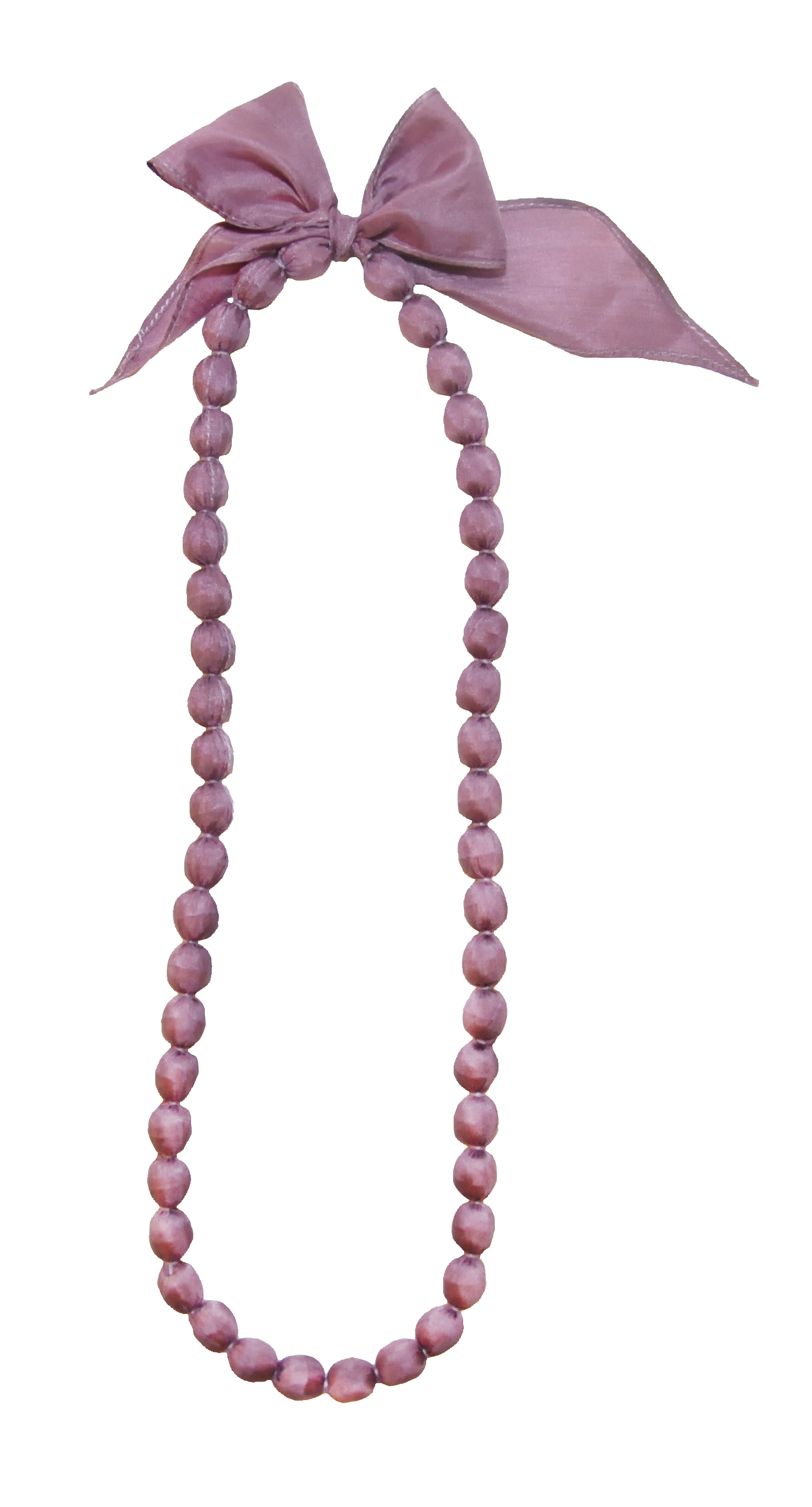 光沢感のあるカンボジアシルクに1粒約1.2㎝のプラスチックビーズを包み、1つ1つしっかり針を通して作っています。