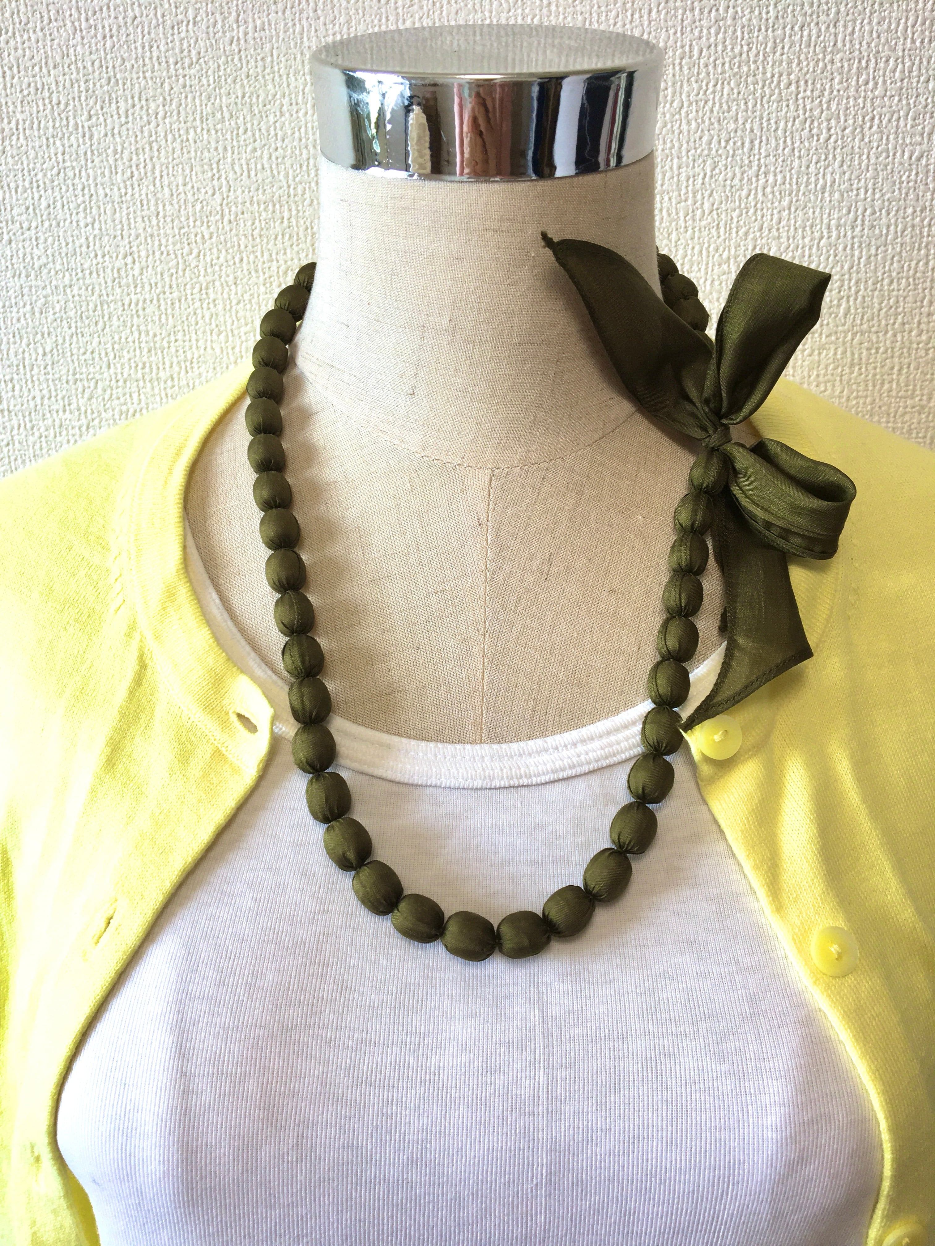 光沢感のあるカンボジアシルクに1粒約1.2㎝のプラスチックビーズを包み、1つ1つしっかり針を通して作っています。